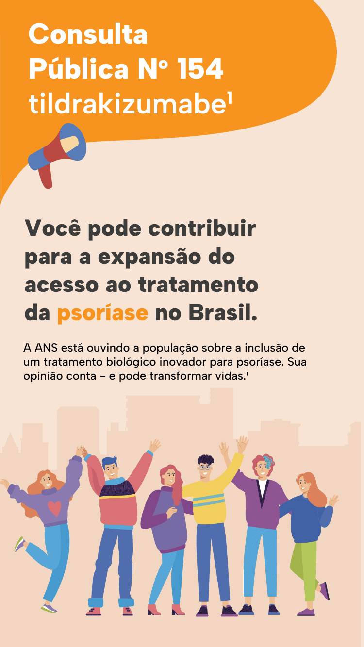 A Consulta Pública é um processo aberto em que a ANS ouve a sociedade antes de tomar decisões. É sua chance de se manifestar sobre a inclusão de novos tratamentos na cobertura dos planos de saúde, como é o caso do tildrakizumabe para psoríase em placas moderadas a grave.¹